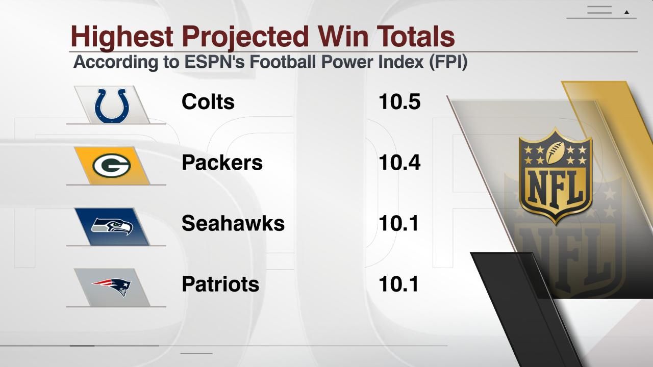 The highest total went to the chiefs, ravens and 49ers at 11.5 wins, while the panthers and patriots were tied for the lowest at only 4.5 wins.